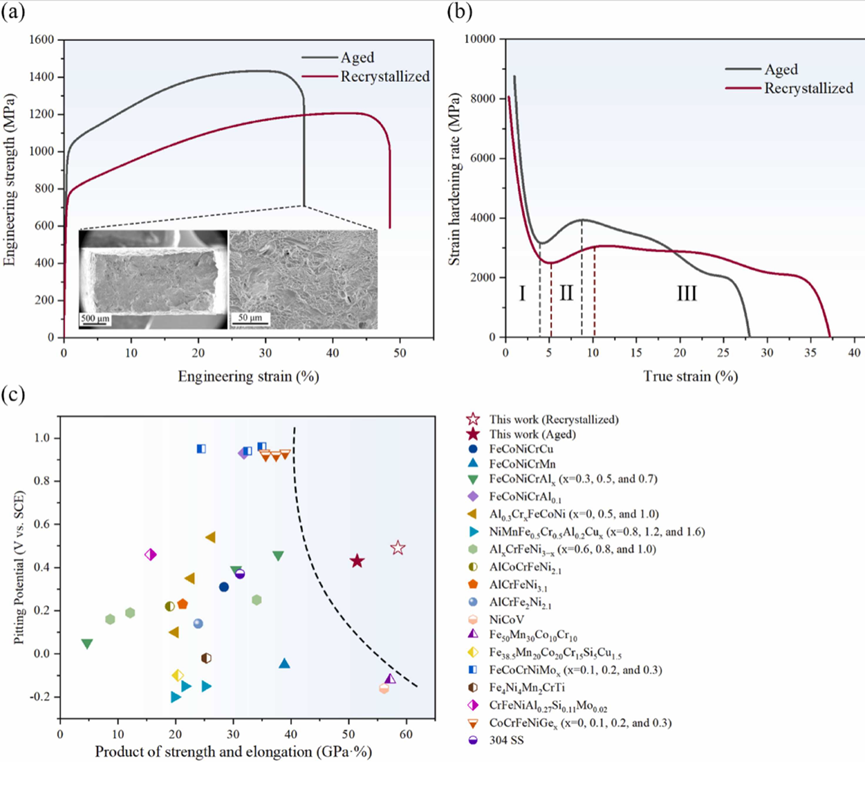 图4 . ( a )再结晶和时效试样的工程应力-应变曲线和( b )相应的应变硬化响应。( a )中的inset显示了时效态试样的典型拉伸断口,宏观颈缩不明显,主要为韧窝,验证了穿晶断裂的特征和优异的拉伸塑性。在( b )的两个样品中都可以观察到三个明显的(Ⅰ、Ⅱ、Ⅲ)阶段。( c ) Al5Nb5高熵合金的点蚀电位与强塑积的关系,并与其他已报道的耐腐蚀高熵合金(化学成分见附录)进行了比较。所有点蚀电位均在3.5 wt . % NaCl溶液中获得,并与传统304 SS进行对比。