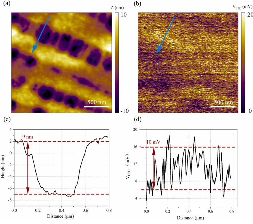 图8 .对800 ℃时效15天的Al5Nb5高熵合金进行SKPFM分析。( a )表面形貌图和( b )相应的VCPD图像。( c )和( d )分别是( a )和( b )中沿蓝色箭头的线轮廓。可以确定FCC基体与L12析出相之间的高度差和VCPD差分别为:9 nm和10 m V。富Ni、Al和Nb的L12析出相在FCC区域和析出相之间的原电池耦合中充当阳极,即电化学活性位点,优先被腐蚀。