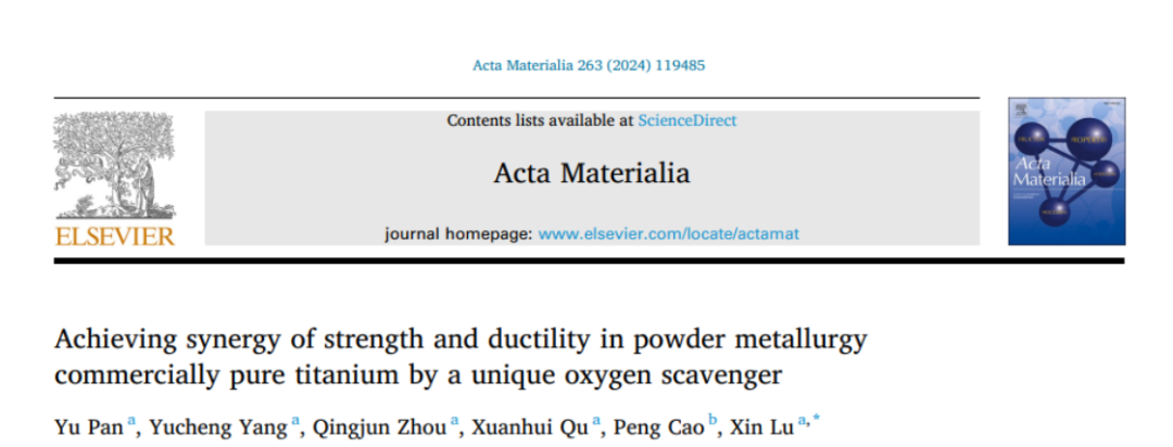 近日,北京科技大学路新教授团队提出了钙系化合物原位固氧提升高氧钛制件强塑性的新方法,相关工作在金属材料顶刊Acta Materialia上发表了题为“Achieving synergy of strength and ductility in powder metallurgy commercially pure titanium by a unique oxygen scavenger”的研究论文,论文第一作者为潘宇副教授,通讯作者为路新教授。