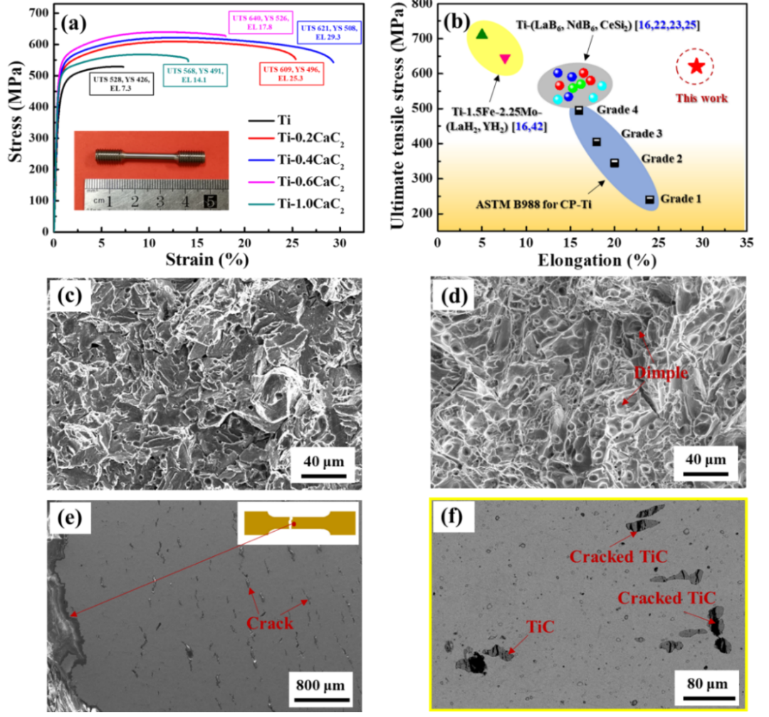 图 5. (a) CP-Ti和Ti-xCaC2合金的室温拉伸工程应力-应变曲线; (b) 拉伸数据综合对比; CP-Ti(c)、Ti-0.2CaC2(d)和Ti-1.0CaC2(e-f)合金的拉伸断口分析。