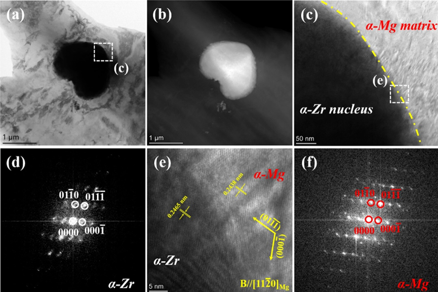 图6 . α - Mg与原位生成Zr核的位向关系:( a ) - ( c ) TEM图像;( d ) ~ ( f )分别为α - Zr和α - Mg的FFT谱