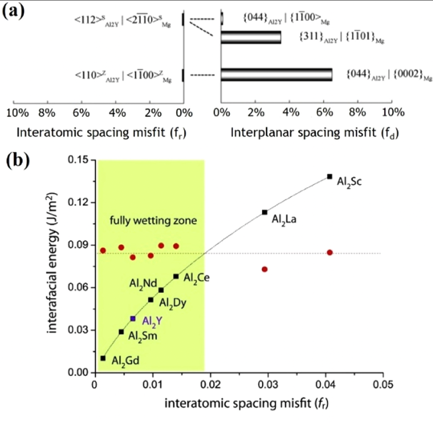 图8 .通过边-边匹配模型计算的Al2Y颗粒与α - Mg基体之间可能存在的取向关系( a )以及原子间距失配与Al2RE颗粒和α - Mg界面能的关系( b )