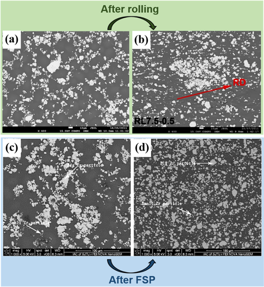 图4 .轧制( a , b)和FSP ( c、d)前后Zr在Mg - Zr中间合金中的分布