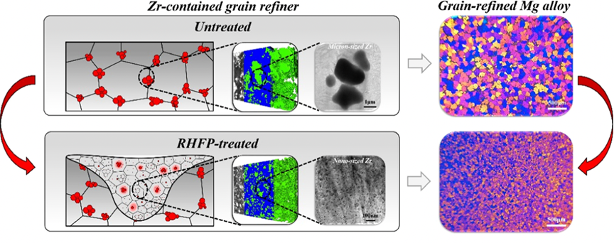 图5 . UHFP - TIGR前后Mg - Zr中间合金中Zr的分布及相应的晶粒细化效果