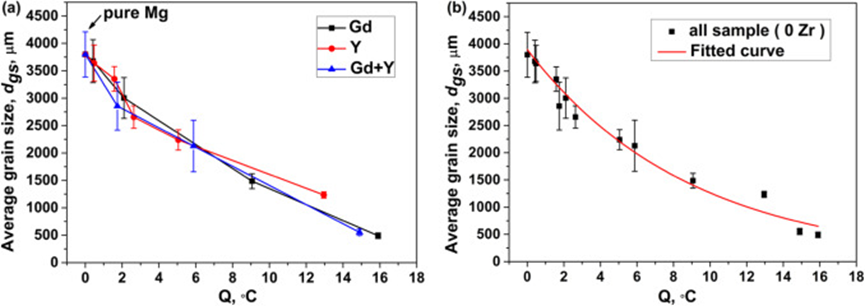 图2 . Mg - RE合金晶粒尺寸对RE元素Q值的依赖性:( a )实验结果;( b )拟合曲线