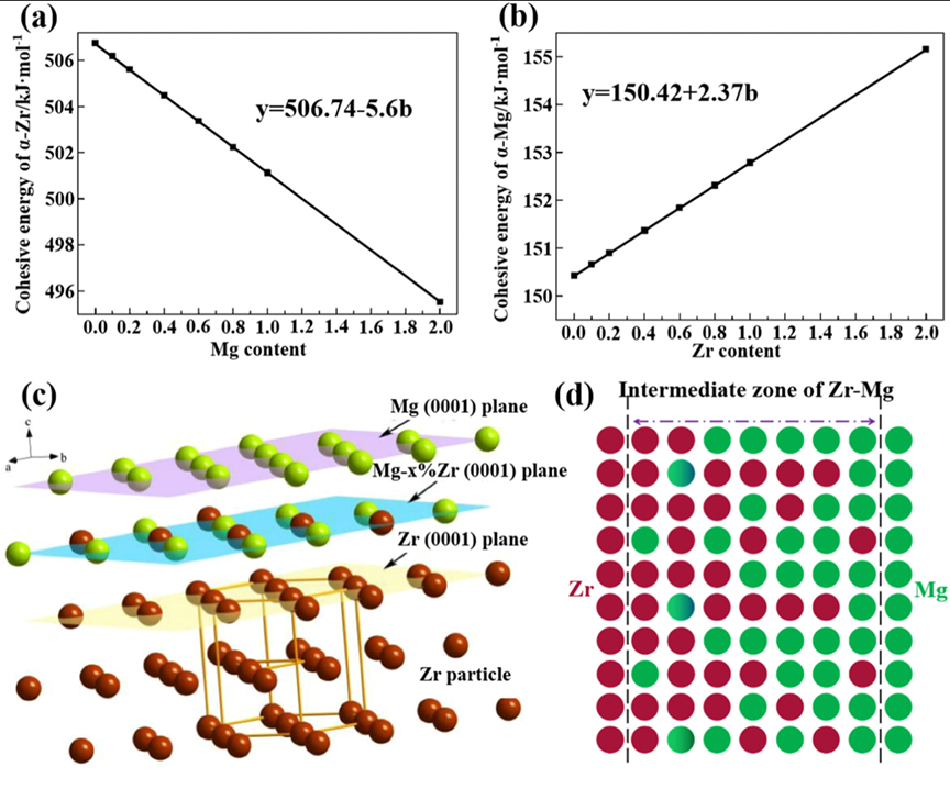 图3 .不同Mg含量Zr的结合能;( b )不同Zr含量Mg的结合能;( c ) Mg - Zr合金异质形核的原子机理示意图;( d ) Zr颗粒表面在凝固过程中形成Zr - Mg过渡层的示意图