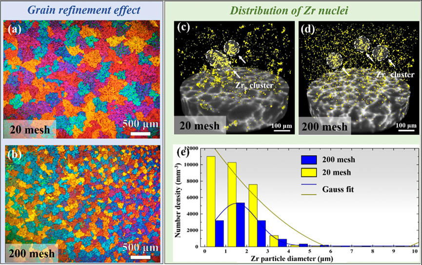 图7 .不同粒径Zr Cl4对铸造Mg - Gd - Y合金的晶粒细化效果:( a )、( b )晶粒细化效果,( c ) ~ ( e ) Zr颗粒在合金中的分布,( e ) Zr颗粒的尺寸分布