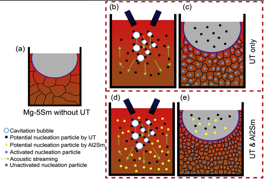 图11 . Mg - Al - Sm合金的晶粒细化机制示意图:( a )未添加UT和晶粒细化剂的Mg - 5Sm二元合金;( b ) Mg - 5Sm二元熔体的UT;( c ) UT对Mg - 5Sm合金凝固过程的影响;( d )含Al2Sm颗粒合金的超声检测;( e )含UT和Al2Sm颗粒合金的凝固过程