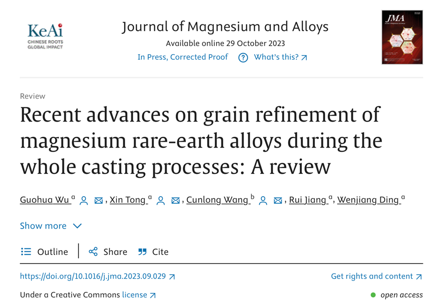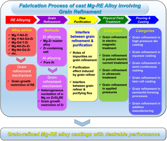 上海交通大学吴国华教授团队发现晶粒细化并不局限于常规添加化学成分,还需要考虑( i )化学孕育和基体Mg - RE合金成分的整体过程;( ii )物理场对晶粒细化的影响;( iii )晶粒细化剂与熔体净化之间的干扰;( iv )铸造工艺及其加工参数。因此,本文综述了在Mg - RE合金的整个铸造过程中,每个过程可能对晶粒细化产生的影响。本综述为研究人员和工程师提供了关于铸造Mg - RE合金晶粒细化的最新进展的系统了解。本工作还将为未来晶粒细化工艺的设计、材料制备工艺路线及其工艺参数的选择提供思路,并为铸态Mg - RE构件的粗化机制提供应对策略,以满足高质量和高性能的需求。相关研究成果以题“Recent advances on grain refinement of magnesium rare-earth alloys during the whole casting processes: A review”发表在Journal of Magnesium and Alloys上。
