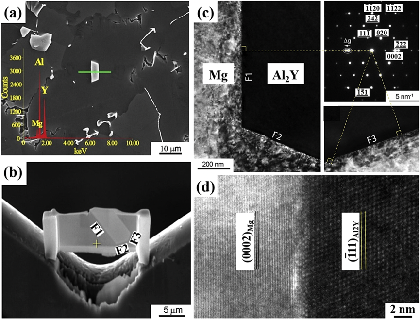 图10 . Al2Y颗粒的显微结构及其与α - Mg基体的位向关系:( a ) SEM图像( b ) Al2Y的横截面( c ) Al2Y / Mg界面的TEM图像与选区电子衍射( d ) Al2Y / Mg界面靠近F1面的HREM图像