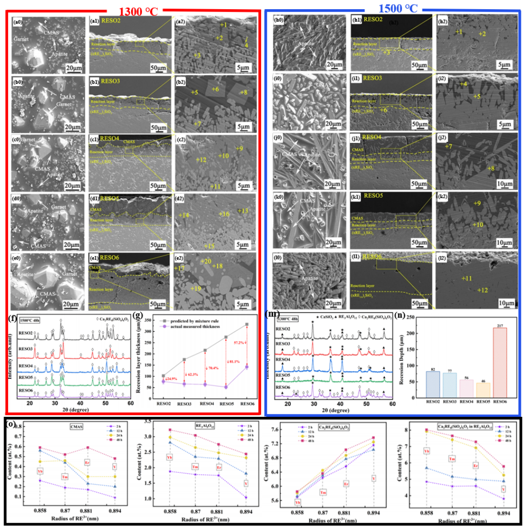 图3 (xRE1/x)2SiO5陶瓷的耐CMAS腐蚀性能。(a-e)在1300 ℃下经CMAS腐蚀48 h后的表面和横截面SEM图像;(f)在1300 ℃下经CMAS腐蚀48 h后的XRD图谱;(g)在1300 ℃下CMAS腐蚀48h后的反应层厚度;(h-l)在1500 ℃下经CMAS腐蚀48 h后的表面和横截面SEM图像;(m)在1500 ℃下经CMAS腐蚀48 h后的XRD图谱;(n)在1500 ℃下CMAS腐蚀48h后的反应层厚度;(o)为残余CMAS熔体、石榴石、反应磷灰石和石榴石中磷灰石相中稀土元素的含量。