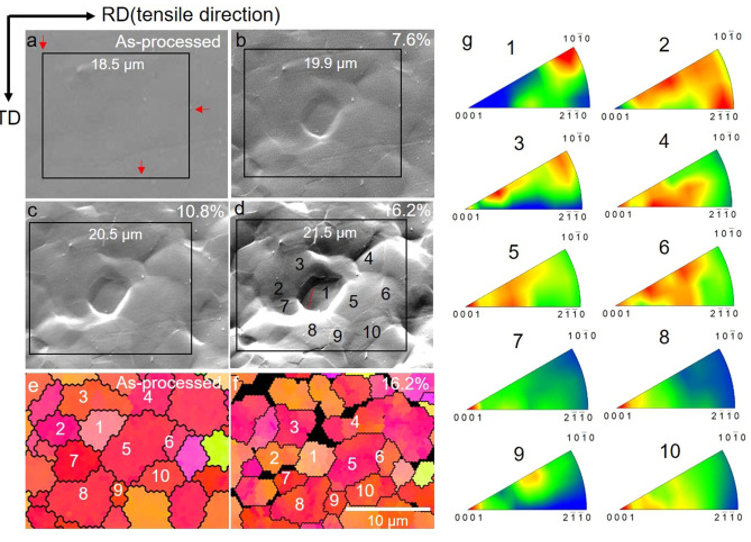 图12. 拉伸过程中选定晶粒变形的现场观察及晶粒内取向偏差分析。(a-d)加工阶段和拉伸率分别为7.6%、10.8%和16.2%时的SEM表面观察。(a)中的红色箭头突出显示了用于跟踪黑色帧中同一区域的表面特征。根据黑框的形状变化计算局部应变。(e, f)处理阶段和延伸16.2%后的EBSD取向图。(g) 16.2%延长率后各晶粒的IGMA反极图。