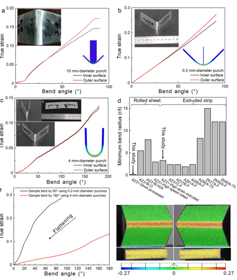 图 5 (a)用直径为10 mm的冲头将1.5 mm厚的挤压带弯曲90°,(b)用直径为0.2 mm和4 mm的冲头将0.5 mm厚的短加工板弯曲90°和(c) 180°时,外表面和内表面的真应变随弯曲角的变化规律。(a、b)中插入的照片显示,板材成功弯曲90°,弯曲半径为3.3T和0.2T, (c)中的照片显示,板材(i)弯曲了约180°,(ii)随后变平,(iii)反向弯曲了约90°,没有任何可见的裂纹。从试验台取出后,弯曲的试样被弹回。(d)本研究和文献报道的轧制薄板和挤压带材的最小弯曲半径,其厚度范围在0.5 ~ 6.3 mm之间。这些样品在室温下被弯曲90度。(e)用直径为0.2 mm和4mm的冲头分别弯曲90°和180°的短加工试样压扁过程中应变演化的DIC结果。(e)中的照片来自弯曲和斑点样品的左右相机,在压平前与应变图叠加。