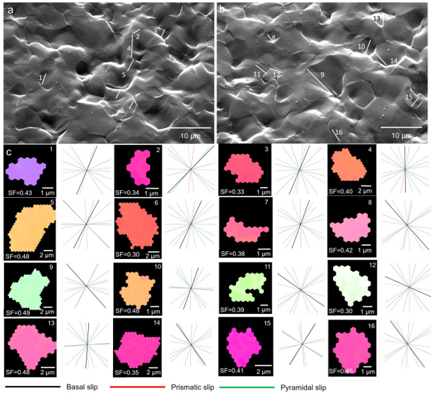 图11. (a, b)短加工AZ31在SEM原位拉伸阶段被拉长13.6%后的两张SEM图像。(c)确定滑移迹的16个颗粒的EBSD取向图。根据它们的方位,可以得到基底滑移、棱柱滑移(3个变量)和锥体II滑移(6个变量)的轨迹方向。通过将潜在滑动轨迹与SEM图像中观察到的滑动轨迹进行匹配,确定了滑动轨迹为基底滑动轨迹。