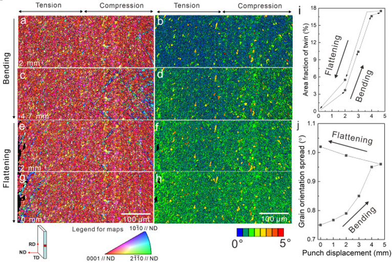 图6 弯曲和压扁过程中的微观结构和应变演化。(a - h)弯曲时冲床从(a, b) 2mm移动到(c, d) 4.7 mm,再移动到(e, f) 2mm和(g, h)弯曲时样品RD-ND表面的原位EBSD取向图和相应的晶粒取向展布图(GOS)。(i)压缩区孪晶面积分数(j)弯曲和压扁过程中凸模位移的函数关系。