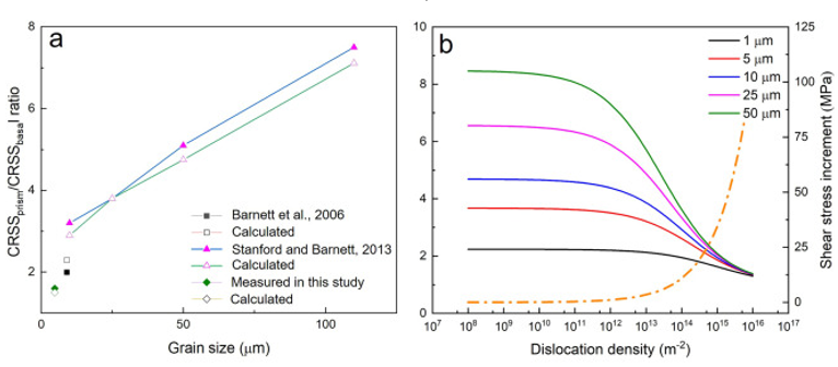 图16 (a)本研究与文献的CRSSprism /CRSSbasal比值吻合较好。(b) CRSSprism /CRSSbasa比值与晶粒尺寸和位错密度的函数关系,以及位错引起的剪应力增量与位错密度的函数关系。