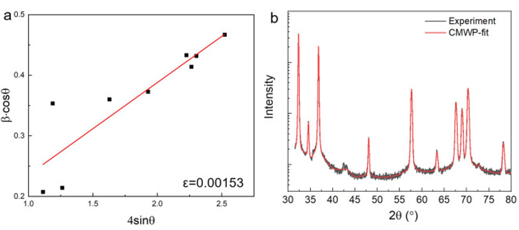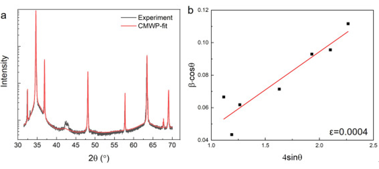 图18 (a)基于Williamson-Hall法峰展宽的微应变计算;(b)前人研究中低温挤压AZ31的实验测量和cmwp -拟合XRD谱图。