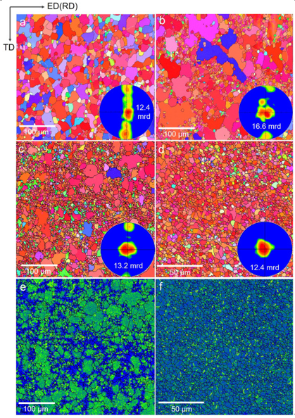 图2所示。(a - d)从ED(RD)-TD面得到的(a)边缘、(b)到边缘、(c)挤压带材中心部分和(d)短加工板材的EBSD方向图和相应的(0002)极点图。(e, f)挤压带材和短加工板材中心部位的KAM图。