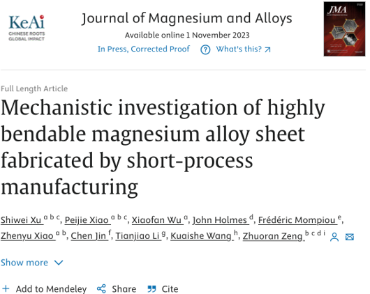 湖南大学机械与车辆工程学院阮秋琦等教授相关研究以“Mechchanisticinvestigation of highbendable magnesium alloy sheet fabricated by short-process manufacturing”为题发表在Journal of Magnesium and Alloys上。