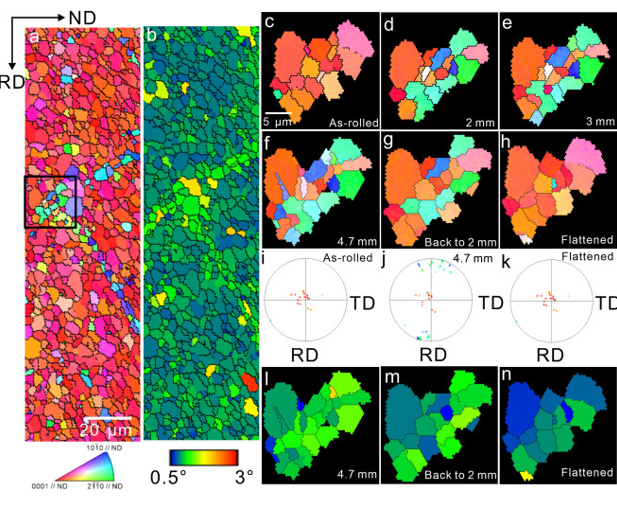 图7 (a, b) EBSD取向图和GOS图显示了弯曲AZ31板的双带相交和沿双带的局部应变。原位EBSD定向图显示弯曲过程中的(c-f)孪晶和压平过程中的(f-h)去孪晶。(i - k)(0001)极形图显示了晶粒和孪晶(i)在轧制状态下的取向,(j)弯曲4.7 mm的冲压位置,(k)压平后的取向。(l-n)原位GOS图显示,从4.7 mm冲孔位置到原始位置的压平过程中,与脱孪生有关的GOS水平下降。