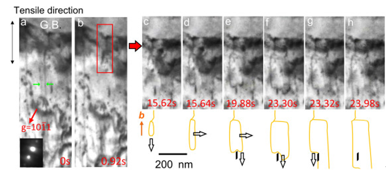 图14. 原位TEM图像序列及相应的位错行为示意图。(a, b) < a >位错的直线螺杆分量在棱柱平面上的湮灭。在插图(b)中显示了湮灭后仍然存在的无柄段,并作为进一步位错的来源(c-h)。入射光束几乎平行于矩阵的[20],且g = 101。