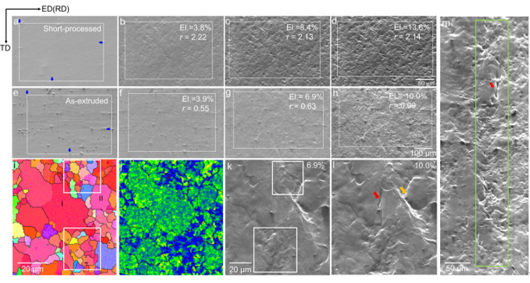 图10 (a, d)短加工态和(e - h)挤压态AZ31试样的原位SEM观察,当测试仪的十字头按试样长度移动(a, e) 0%, (b, e) 10%, (e, f) 15%, (d, h) 20%时。用蓝色箭头突出显示的表面特征用于跟踪同一区域(用白色矩形突出显示)。(i - 1)高倍拉伸试验中挤压态AZ31的观察。(i) EBSD方向图,(j)对应的KAM图,(k, l)局部区域延伸率为6.9%和10.0%时的SEM图像。白色矩形突出了与变形晶粒I和II相邻的再结晶晶粒。(1)中的红色和黄色箭头分别表示晶粒I中存在晶内裂纹,晶粒I和晶粒II之间存在严重变形。(m)挤压态AZ31拉伸率为10.0%时沿TD的局部应变和裂纹(绿色矩形突出显示)。