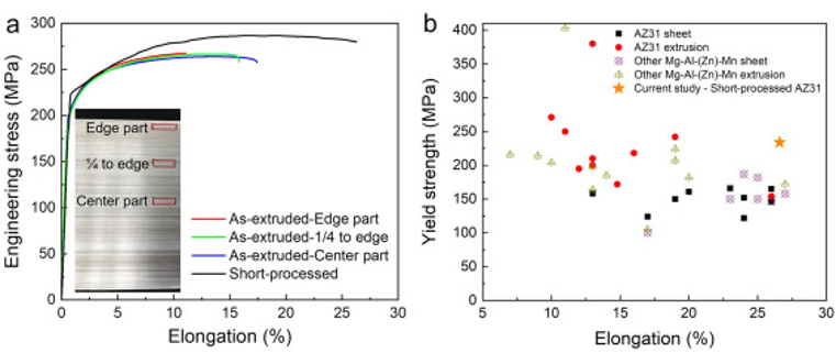 图 4 (a)挤压带材和短加工板材的工程应力-应变曲线。插入显示边缘部分,到边缘,和中心部分作为挤压带。(b)与文献报道的AZ基合金的拉伸性能比较。