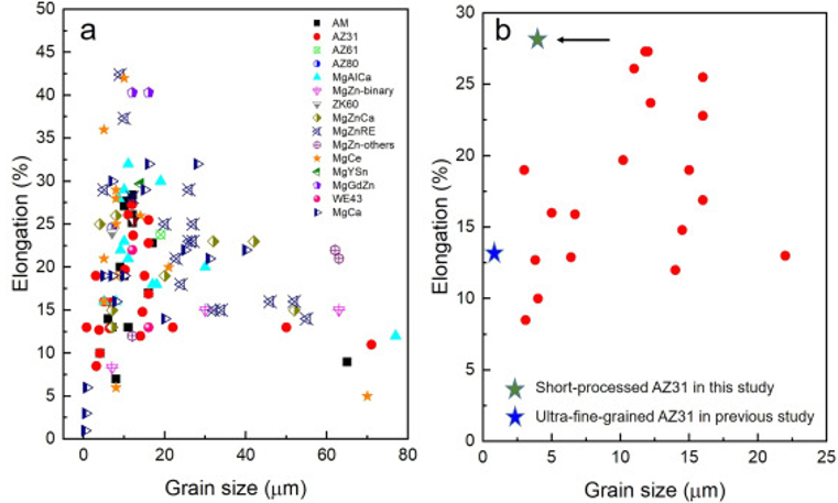 图17 来自文献的数据回顾关于(a) Mg挤压和轧制合金和(b)挤压和轧制AZ31合金在不同条件下的伸长率和晶粒尺寸。