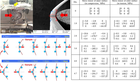 图1所示。现场EBSD观测弯曲和压平过程的设置图像和示意图。通过有限元模拟,得到了原位弯曲试验的内、外表面应力张量。有限元模拟的输入参数如表1所示。
