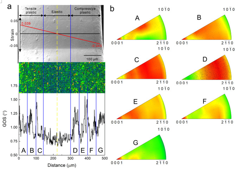 图8 (a)当冲头移动到4.7 mm位置时,试样侧面弯曲后的SEM图像。可以区分拉伸、压缩塑性变形区和弹性变形区。用有限元法计算了外表面0.039 ~内表面- 0.043的真实应变分布,给出了计算结果。中性线用黄色虚线表示,虚线向拉伸区偏移。根据晶粒取向扩展(GOS)图,将塑性变形区域划分为7个区域(标记为a - g),每个区域的宽度为~ 50 um。给出了7个塑性变形区域和弹性变形区域的GOS。(b) A-G区晶粒内取向轴(IGMA)分析。