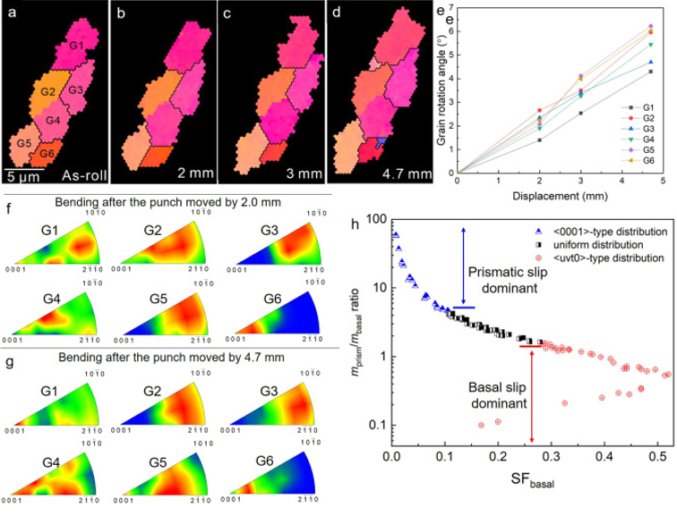 图9 (a-d)弯曲至4.7 mm冲孔位移时拉伸区选定晶粒G1-G6的原位EBSD取向图。(e)弯曲过程中所选六种颗粒的颗粒旋转角度随冲床位置的变化。(f, g)各颗粒弯曲至(f) 2-mm和(g) 4.7 mm冲孔位置后的IGMA反极图。(h)从拉伸区随机选取100个晶粒弯曲至4.7 mm冲孔位置后的IGMA类型、mbasal和mprism/mbasal。