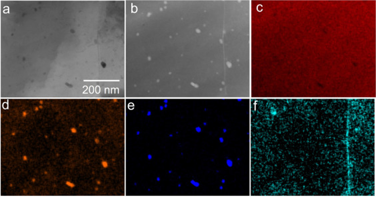 图15 (a)短加工AZ31板材明场和(b)高角度环形暗场图像,以及(c) Mg、(d) Al、(e) Mn、(f) Zn元素的EDX元素映射。