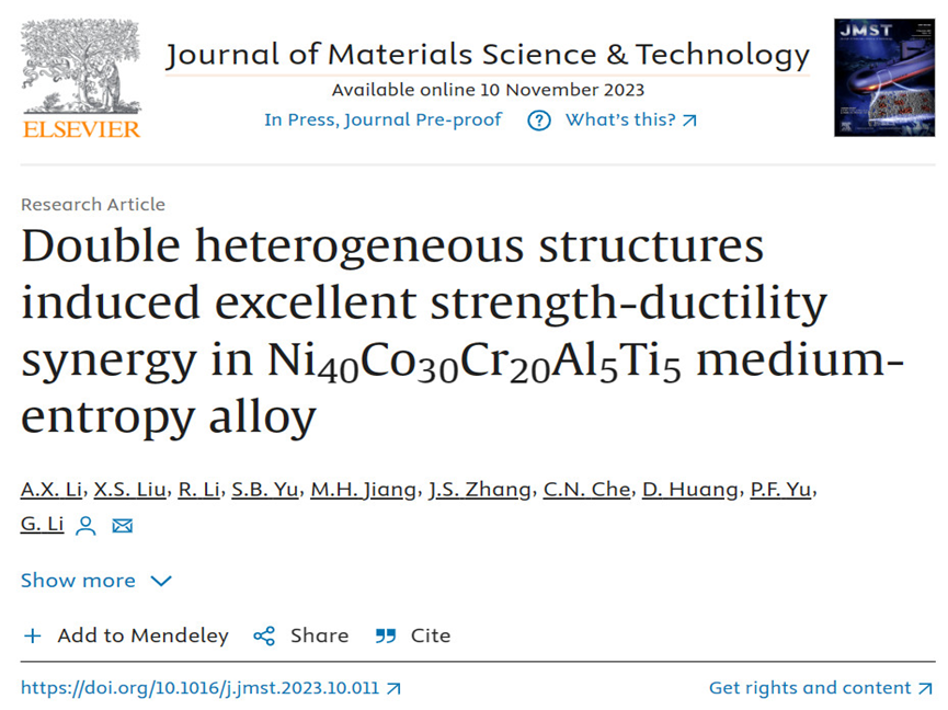 受上述分析的启发,燕山大学亚稳态材料科学与技术国家重点实验室相关研究员展开了深入研究,其目标通过实施双重异质结构,开发具有良好强度和延展性组合的MEA。研究者选用Ni40Co30Cr20Al5Ti5合金,通过组织观察发现铸态合金中存在L12相。通过对机械热处理工艺的改进,对含L12相的合金进行了冷轧和热处理。这一过程由于晶粒尺寸的差异和晶内析出物颗粒的不同导致了双重异质结构的形成。系统地研究了合金的微观组织,并分析了其中涉及的强化和变形机制。这些发现为高性能合金的设计提供了有价值的见解。相关研究成果以题为Double heterogeneous structures induced excellent strength-ductility synergy in Ni40Co30Cr20Al5Ti5 medium-entropy alloy发表在Journal of Materials Science & Technology上。