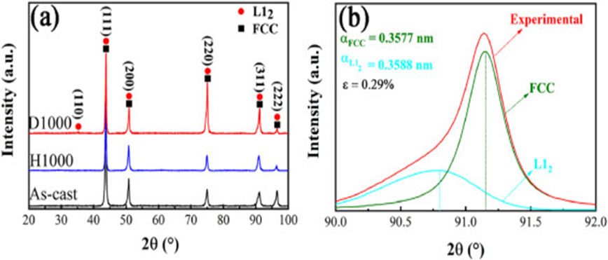 图2 Ni40Co30Cr20Al5Ti5 MEAs的物相组成。( a )不同状态MEA的XRD图谱。衍射花样显示FCC和L12相共存。( b ) ( 311 )衍射峰的去卷积,用于确定D1000合金中FCC和L12的晶格常数。