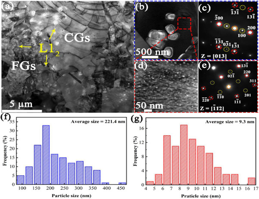 图5 D1000合金的TEM结果。( a )亮场( BF )图像显示晶粒内的CGs,FGs和亚微米析出物。沿[ 013 ]方向拍摄的( b , c)暗场( DF )图像和相应的选区电子衍射( SAED )显示出L12型亚微米析出相。沿区域轴拍摄的( d , e) DF图像和相应的SAED显示了L12型纳米析出相。( f , g)各区域亚微米级析出物和纳米级析出物的粒径分布。