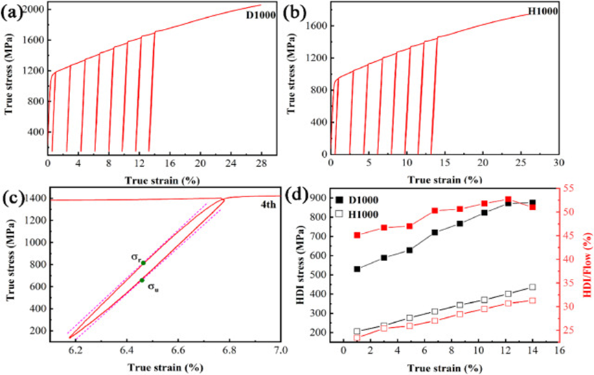 图10 δHDI 对力的贡献。( a ) D1000合金的加载-卸载-再加载( LUR )真应力-应变曲线。( b ) H1000合金的LUR真应力-应变曲线。( c )增大了4th的磁滞回线。( d ) HDI对真应变和流变应力与HDI应力之比的依赖性。
