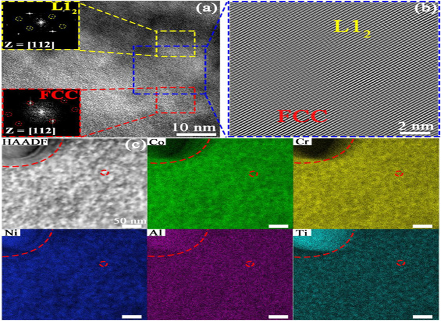图8 H1000合金中L12析出相的相结构和元素分布。( a ) HRTEM图像和相应的FFT图像。黄色方框表示L12相的FFT,红色方框表示FCC基体的FFT。( b )显示FCC / L12相干界面的蓝色方框IFFT。( c ) L12析出相对应的TEM - EDS图谱。
