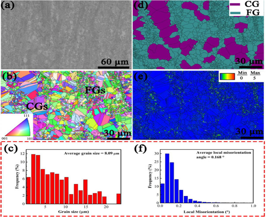 图3 D1000合金的显微组织。( a )代表性Sem图像。( b ) IPF和( c )全区粒度分布。( D ) CG区和FG区的分布。紫色区域为CG区域。( E ) Kam图。( f )整个区域的局部取向差。D1000合金呈现出32.6 %的粗晶和67.4 %的细晶的不均匀分布。