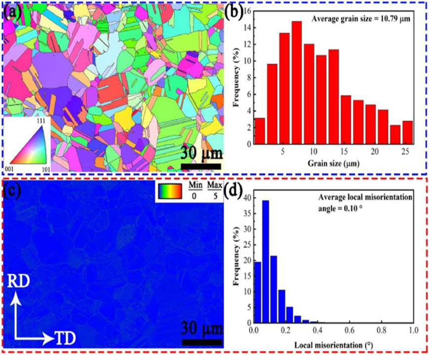 图4 H1000合金的EBSD结果。( a ) Ipf图。( b )全区粒度分布。( c ) Kam图。( d )整个区域的局部取向差。H1000合金呈现均匀分布的等轴晶,平均尺寸为10.79 μ m,随机取向。