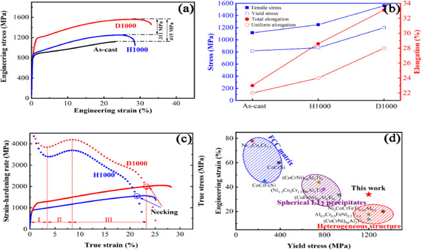 图9 Ni40Co30Cr20Al5Ti5在不同状态下的力学性能。( a ) MEAs在室温下的工程应力-应变曲线。( b )各种MEA的屈服应力、拉伸应力、总延伸率和均匀延伸率。( c ) D1000和H1000 MEAs的真应力-应变曲线和应变硬化率曲线。( d ) D1000 MEA与其他合金的屈服强度和总延伸率的比较。