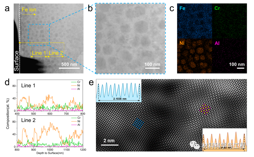 图 4.(a-b) 铁镍铬铝中辐照铁素体的 STEM 图像;(c) 铁镍铬铝中铁素体的 EDS 图谱和 (d) 线扫描剖面图;(e)距表面约 400 毫米处高分辨率 TEM 图像的 IFFT,显示基体和沉淀之间不同的晶体结构。