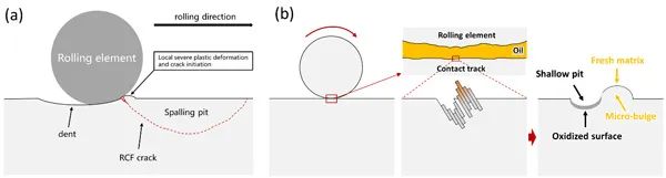 图3.(a)凹痕诱发表面裂纹萌生机制;(b)超高循环周次下表面微塑性变形机制