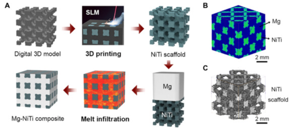 图6. Mg-NiTi互穿相复合材料的制备及三维结构。(A) 3D打印镍钛诺支架制备Mg-NiTi互渗相复合材料的工艺示意图,随后用镁熔体对支架进行无压渗透。选择性激光熔化。(B)渗透复合材料和(C)复合材料内菱形十二面体形式的镍钛诺增强体的x射线断层扫描(XRT)体积图,通过过滤镁的信号获得。