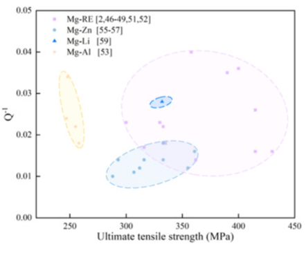 文献报道的镁合金阻尼能力和极限抗拉强度汇总如图3所示。可以看出,Mg-RE合金具有优异的阻尼能力和强度。本章总结了最新开发的高阻尼性能(应变幅为1 × 10−3时Q−1 > 0.01)、强度大于300 MPa的镁合金。