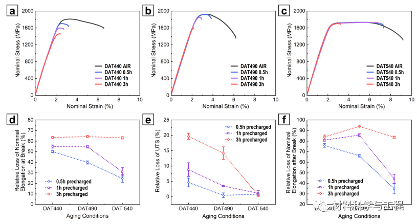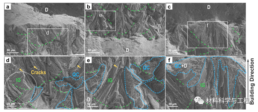 图 6. 拉伸试样(预充电 3 小时)断裂表面局部区域的形态:(a、d)DAT440、(b、e)DAT490 和(c、f)DAT540 试样,(d-f)图像(a-c)中局部放大的区域。