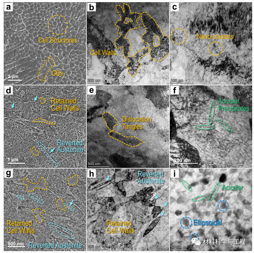 图 2. 不同时效状态下 L-PBF 18Ni(300) 钢的微观组织形态:(a-c)DAT440、(d-f)DAT490、(g-i)DAT540 试样。图 2(a、d、g)为二次电子(SE)图像,其他为 TEM-亮场(TEM-BF)图像。