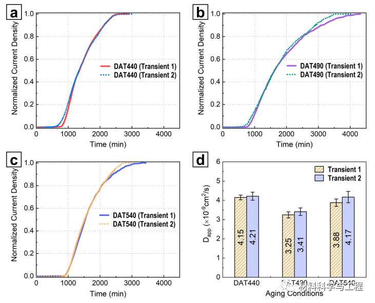 图 7. 积聚瞬态氢渗透曲线(a-c)和测得的表观扩散系数(d)。