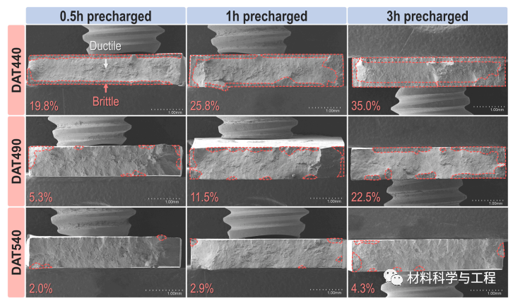 图 5. 充氢不同时间的拉伸试样断裂面的外观。图像中标注的百分比表示脆性开裂区域的面积分数。