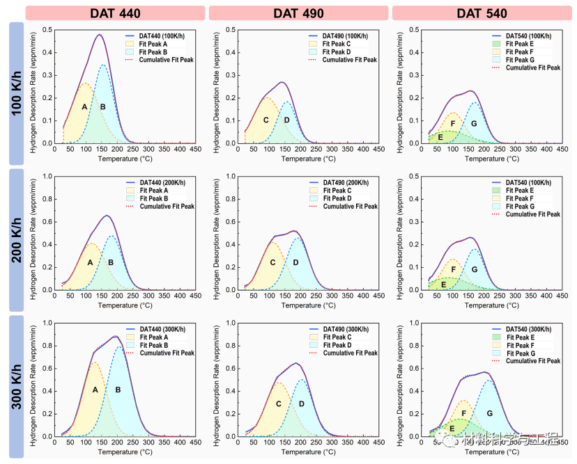 图 8. 不同测试条件下的热解吸光谱(TDS)及其拟合曲线。