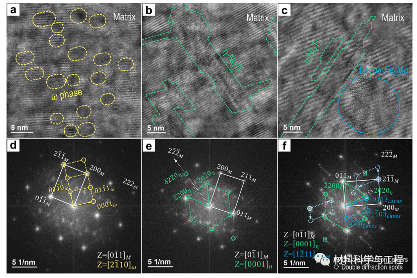 图 3. 在不同温度下时效的 L-PBF 18Ni(300) 试样中析出物的 HR-TEM 图像(a-c)和相应的 FFT 图形(d-f):(a、d)DAT440、(b、e)DAT490 和(c、f)DAT540 试样。